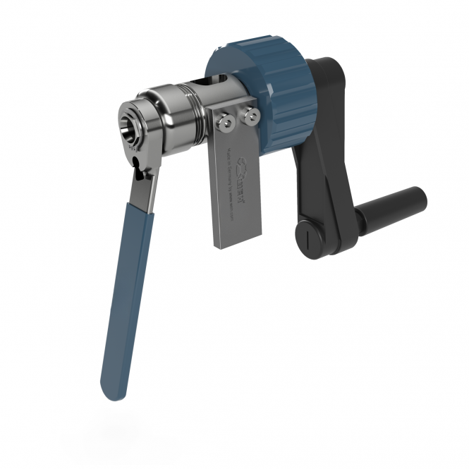 Hand tool for manual bending of high pressure lines. Bending inserts are available for different tube sizes.